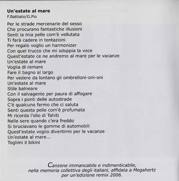 | Guitar Alessandro De Crescenzo | Remix, Vocoder, Synthesizer, Electronic Drums, Guitar, Recorded By Megahertz | Written-By Franco Battiato, Giusto Pio | |||