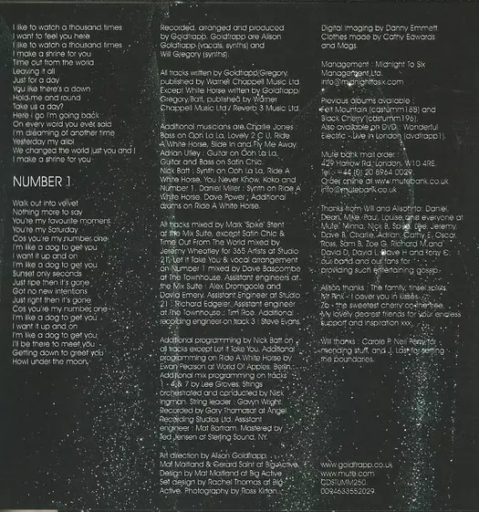 Goldfrapp egy 1999-ben Londonban alakult angol elektronikus zenei duó, amelyet Alison Goldfrapp énekesnő és Will Gregory billentyűs alkot. A zenekar filmszerű hangzásvilágáról és Alison kísérteties énekéről ismert, melyben a szinti-pop, a folk, a klasszikus zene és a trip-hop eleme...