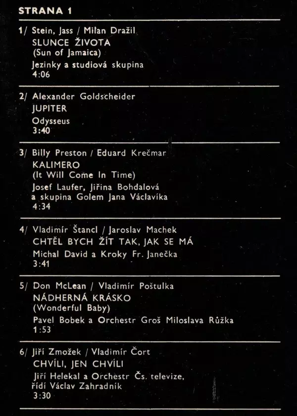 Backing Band Kroky | Leader František Janeček | Lyrics By Jaroslav Machek | Music By Vladimír Štancl | Vocals Michal David | |||
