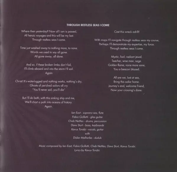 Bass, Keyboards Dave Sturt | Drums, Percussion Cheb Nettles | Guest, Duduk Didier Malherbe | Guitar [Gliss] Fabio Golfetti | Soprano Saxophone, Flute Ian East | Vocals, Guitar Kavus Torabi
