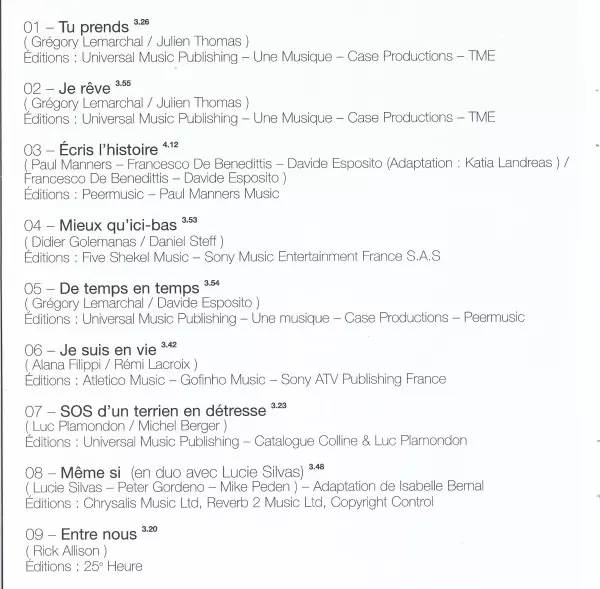 Adapted By [Adaptation De] Isabelle Bernal | Bass Paul Turner | Conductor [Strings], Arranged By [Strings] Nick Ingman | Drums, Programmed By Charlie Russell | Engineer [Assistant Et Ingénieur Protools] Keith Gary | Featuring [En Duo Avec] Lucie Silvas | Guitar Graham Kearns | Keyboards Peter Gordeno | Leader [Chef D'orchestre] Gavyn Wright | Mixed By Michael H. Brauer | Piano, Vocals Lucie Silvas | Recorded By Martin Hayles | Recorded By [Enregistrement Des Voix Françaises], Mixed By [Mixage Additionnel] Christian Lachenal | Recorded By [Strings] Gary Thomas (4) | Written-By Lucie Silvas, Michael Peden, Peter Gordeno