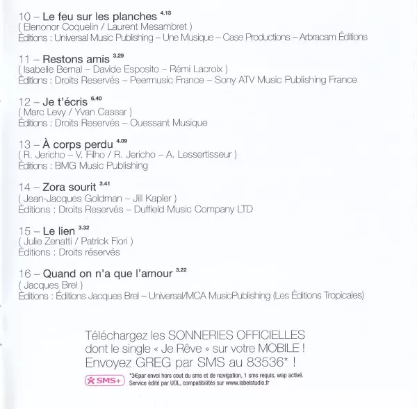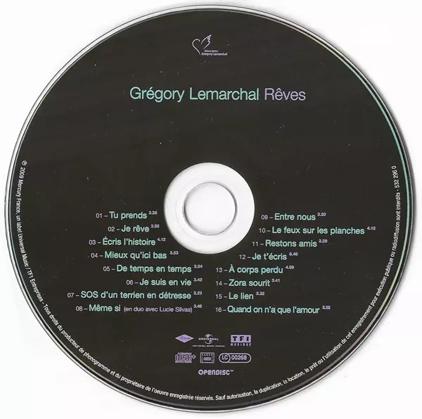 Grégory Lemarchal: Rêves A lemezen lévő változat CD - standard kiadás. Ez a különleges kiadás - Franciaország a kiadó által Mercury év 16. november 2009. Album műfajok között Pop, Ballada és Chanson. Super Jewel Case.