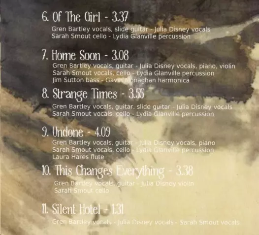 Accordion Matt Marks (5) | Double Bass Jim Sutton (3) | Percussion Lydia Glanville | Vocals, Cello Sarah Smout | Vocals, Guitar Gren Bartley | Vocals, Violin Julia Disney