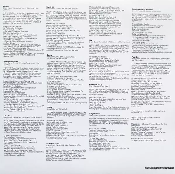 Backing Vocals Harry Styles | Electric Guitar Leo Abrahams | Engineer Sammy Witte | Engineer [Assistant] Dan Ewins | Mixed By [Assistant] Michael Freeman (13) | Producer [Additional] Tyler Johnson | Producer, Piano, Synthesizer [Moog Bass], Organ Tom Hull