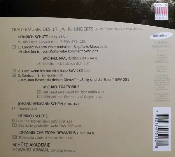 | Művész | Heinrich Schütz | Michael Praetorius | Johann Hermann Schein | Howard Arman | Schutz-akademie | Christopher Demantius |