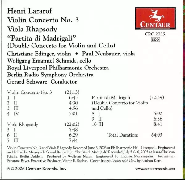 | Composed By Henri Lazarof | Conductor Gerard Schwarz | Orchestra Royal Liverpool Philharmonic Orchestra | Violin Christiane Edinger | ||