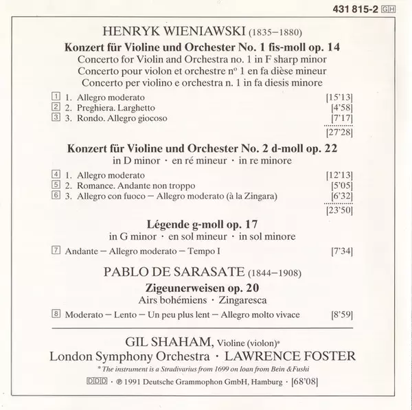 | Művész | The London Symphony Orchestra | Pablo De Sarasate | Gil Shaham | Henryk Wieniawski | Lawrence Foster |