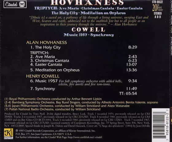 | Cím | Triptych • The Holy City • Meditation On Orpheus / Cowell: Music 1957 • Synchrony |