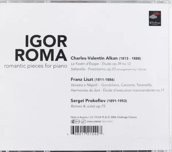 | Művész | Sergei Prokofiev | Franz Liszt | Charles-Valentin Alkan | Igor Roma |