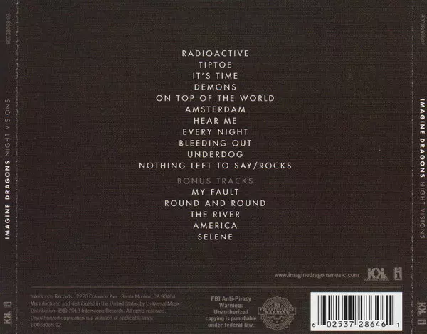 Imagine Dragons: Night Visions DLX A lemezen lévő változat CD - deluxe kiadás. Ez a különleges kiadás - USA a kiadó által KIDinaKORNER a következőkkel együttműködve Interscope Records év 12. február 2013.