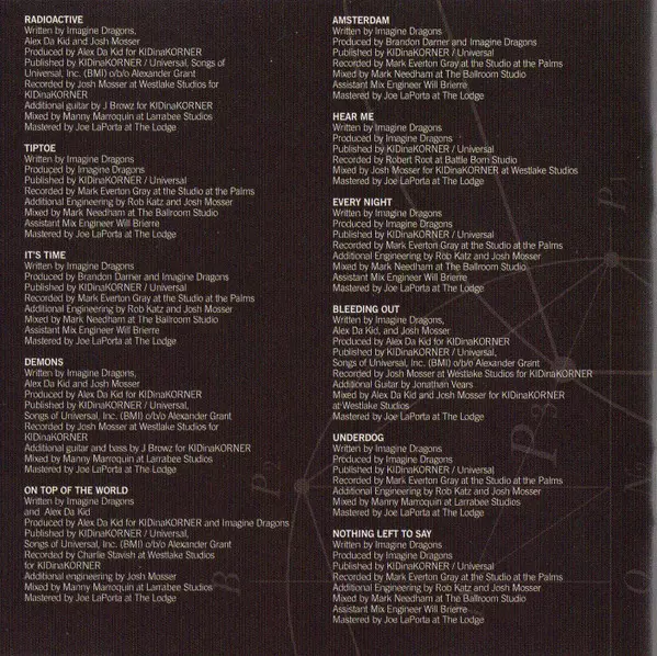 Engineer [Additional] Josh Mosser, Rob Katz | Mixed By Manny Marroquin | Recorded By Mark Gray (5) | Written-By, Producer Imagine Dragons