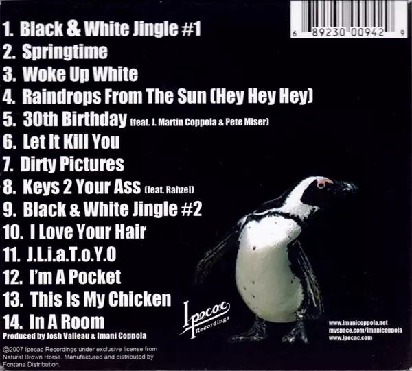 Imani Coppola: The Black & White Album A lemezen lévő változat CD - standard kiadás. Ez a különleges kiadás - USA a kiadó által Ipecac Recordings év 1. április 2016. Album műfajok között Rock, Pop, Elektronikus zene, Funk / Soul, Hip Hop, Punk, Indie Rock, Electro, Synth-Pop, Avant-garde és Funk.