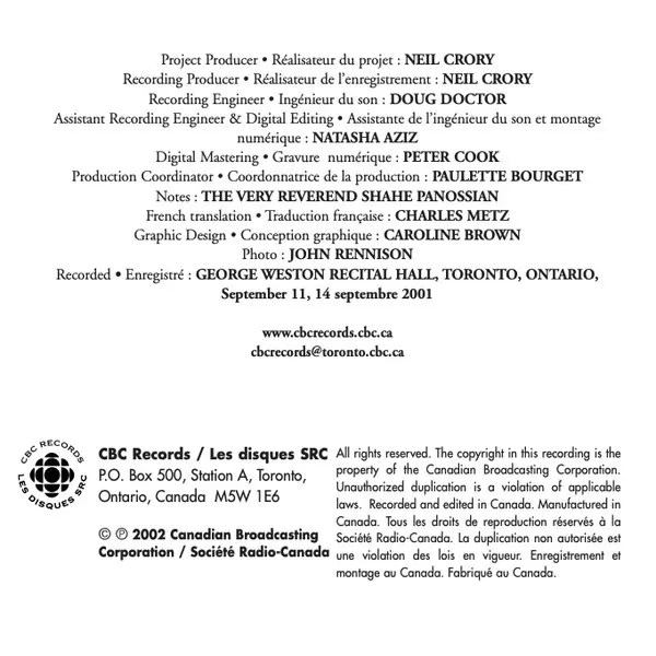 | Művész | Isabel Bayrakdarian | Elmer Iseler Singers | Raffi Armenian |