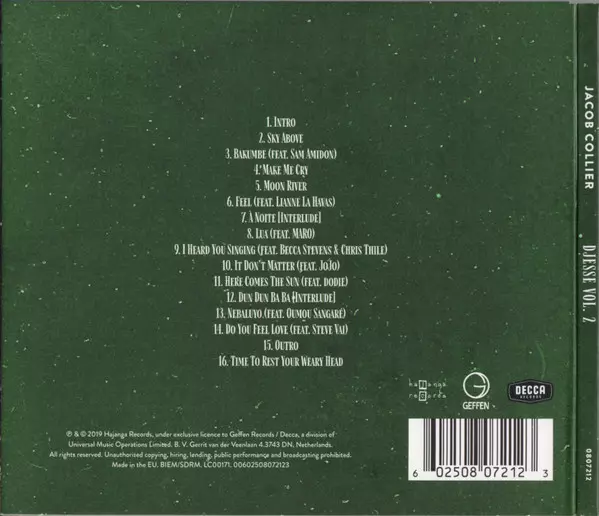 Jacob Collier: Djesse Vol. 2 A lemezen lévő változat CD - standard kiadás. Ez a különleges kiadás - Európa a kiadó által Decca a következőkkel együttműködve Geffen Records és Hajanga Records év 24. január 2020. Album műfajok között Jazz, Folk, Contemporary Jazz, Contemporary R&B és Afro-Cuban Jazz.