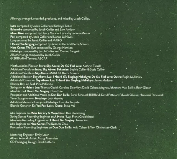 Bass [Additional Bass] Robin Mullarkey | Composed By Jacob Collier | Drums [Additional Drums] James Maddren | Northumbrian Pipes Kathryn Tickell | Vocals [Additional Vocals] Becca Stevens, MARO (18), Sophie Collier, Suzie Collier