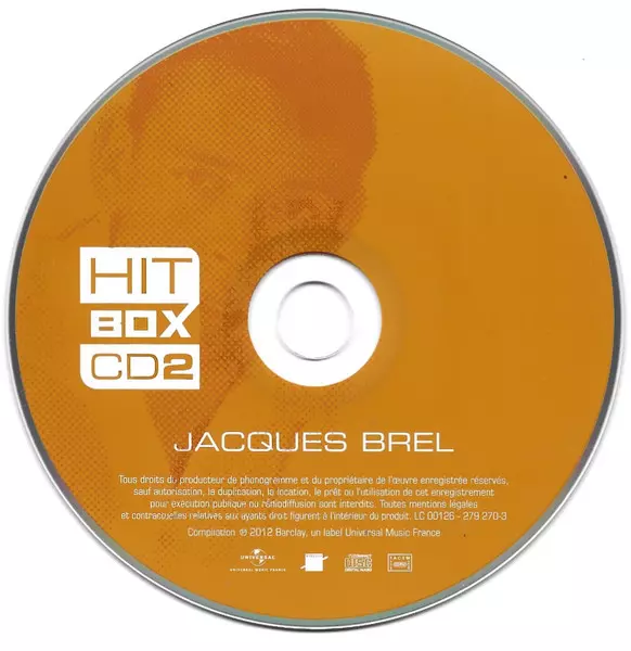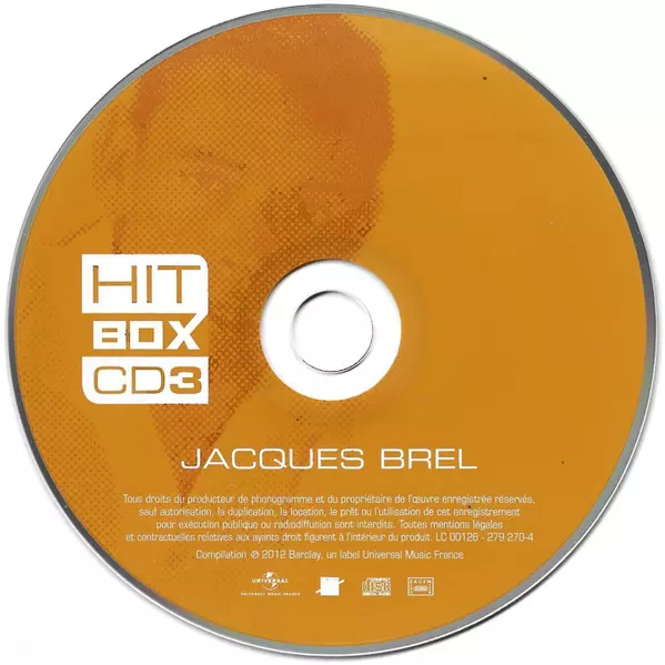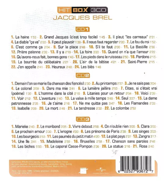 Jacques Brel: Hit Box A lemezen lévő változat 3CD - standard kiadás. Ez a különleges kiadás - Európa a kiadó által Barclay a következőkkel együttműködve Universal Music France év 30. október 2020. Album műfajba sorolható Pop.