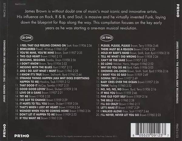 James Brown: The Essential Early Recordings A lemezen lévő változat 2CD - felújított kiadás. Ez a különleges kiadás - Európa a kiadó által Primo (2) év 9. augusztus 2011. Album műfajok között Funk / Soul, Rhythm & Blues és Soul.