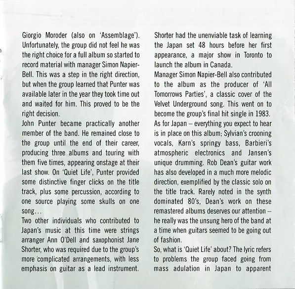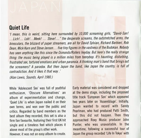 Japan was founded in London in 1974. Originally influenced by the glam rock of David Bowie and The New York Dolls, singer-songwriter David Sylvian, bassist Mick Karn, keyboardist Richard Barbieri, drummer Steve Jansen and guitarist Rob Dean turned to synth pop and explored the genre with some very experimental songs. In March 1978, they made the...