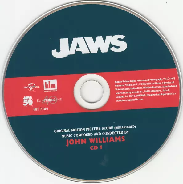 John Williams: Jaws (50th Anniversary Edition) A lemezen lévő változat 3CD - felújított kiadás. Ez a különleges kiadás - USA a kiadó által Intrada év 3. október 2025. Album műfajok között Soundtrack, Film Score, Cinematic Classical, Orchestral és Halloween Music. Special Anniversary Collector's Edition 3CD.