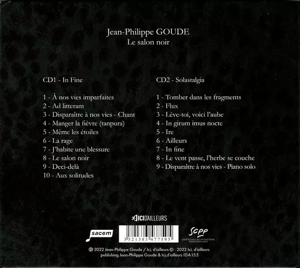 Jean-Philippe Goude: Le Salon Noir A lemezen lévő változat 2CD - standard kiadás. Ez a különleges kiadás - Franciaország a kiadó által Ici D'Ailleurs év 5. július 2024. Album műfajok között Klasszikus zene, Contemporary classical és Neo-Classical.