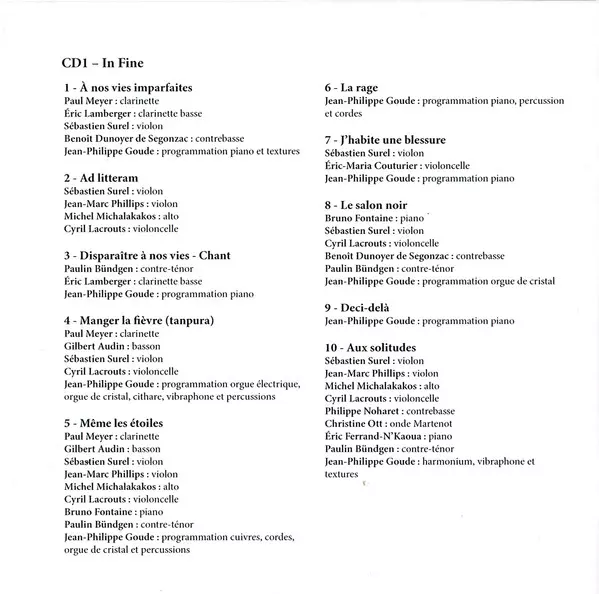 Bassoon Gilbert Audin | Clarinet Paul Meyer | Electric Organ, Organ [Orgue De Cristal], Zither, Vibraphone, Percussion, Programmed By Jean-Philippe Goude | Violin Sébastien Surel | Violoncello Cyrille Lacrouts