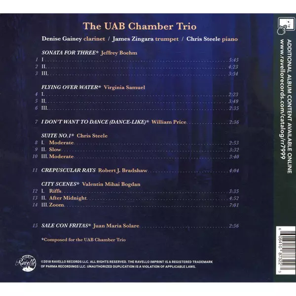 | Művész | Denise Gainey | Jeffrey Boehm | Virginia Samuel | William Price | Chris Steele | Robert J. Bradshaw | Valentin Mihai Bogdan | Juan María Solare | The UAB Chamber Trio | James Zingara |