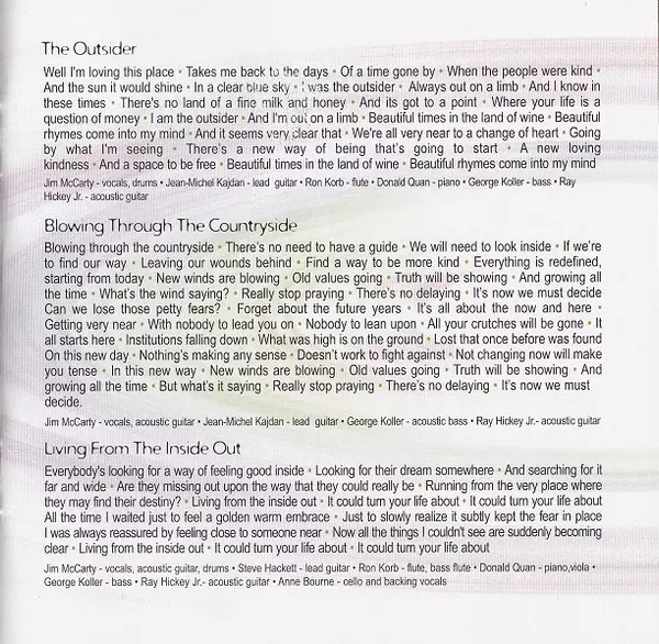 Acoustic Guitar Ray Hickey Jr. | Bass George Koller | Cello Anne Bourne | Flute, Bass Flute Ron Korb | Piano, Viola Donald Quan | Vocals, Acoustic Guitar, Drums Jim McCarty