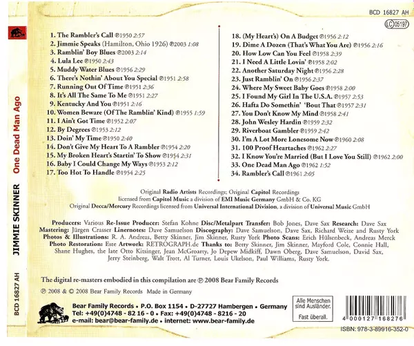 Jimmie Skinner: One Dead Man Ago A lemezen lévő változat CD - standard kiadás. Ez a különleges kiadás - Németország a kiadó által Bear Family Records év 5. augusztus 2008. Album műfajok között Folk, World, & Country, Country, Hillbilly és Honky Tonk.