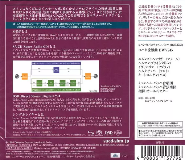 Johann Sebastian Bach: Johannes-Passion LTD A lemezen lévő változat 2SACD - korlátozott példányszámban felújított kiadás. Ez a különleges kiadás - Japán a kiadó által Archiv Produktion év 25. március 2016. Album műfajok között Klasszikus zene, Barokk zene és Religious.