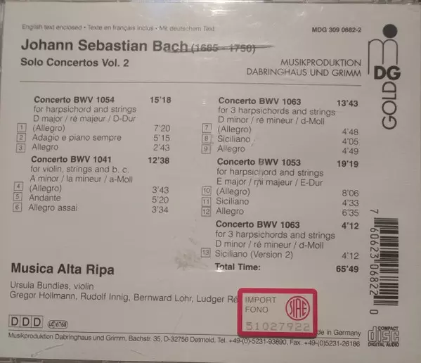 | Cím | Solo Concertos Vol. 2 (Violin Concerto A Minor BWV 1041, Harpsichord Concertos BWV 1053, 1054, 1063) |