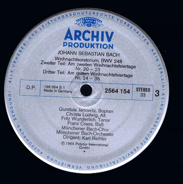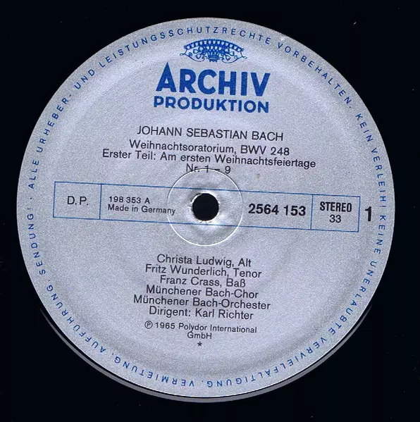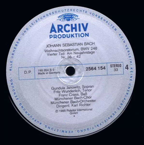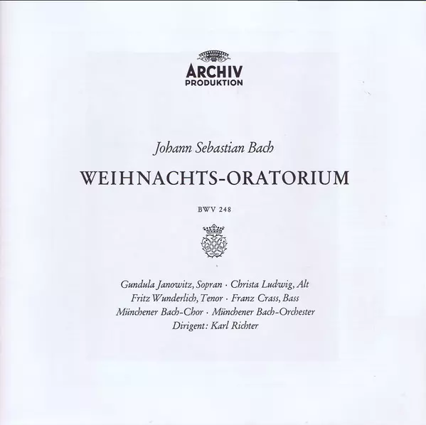 | Művész | Johann Sebastian Bach | Gundula Janowitz | Christa Ludwig | Karl Richter | Fritz Wunderlich | Münchener Bach-Orchester | Franz Crass | Münchener Bach-Chor |