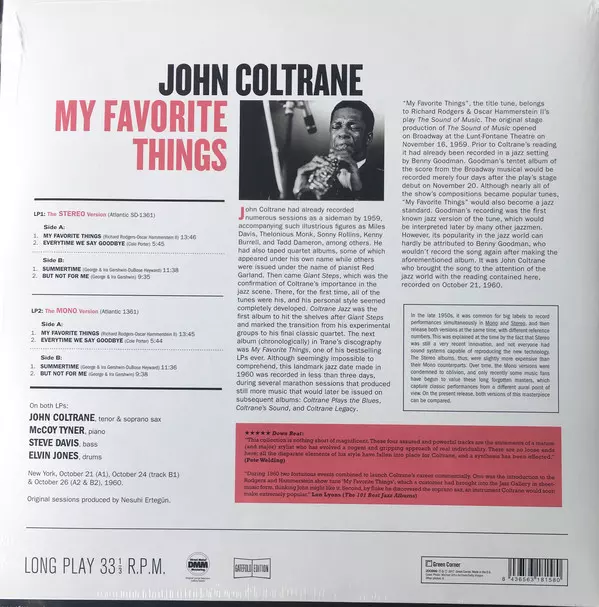 John Coltrane: My Favorite Things - The Stereo & Mono Versions LTD A lemezen lévő változat bakelitlemez 2LP - korlátozott példányszámban kiadás. Ez a különleges kiadás - Európa a kiadó által Green Corner év 26. január 2018.