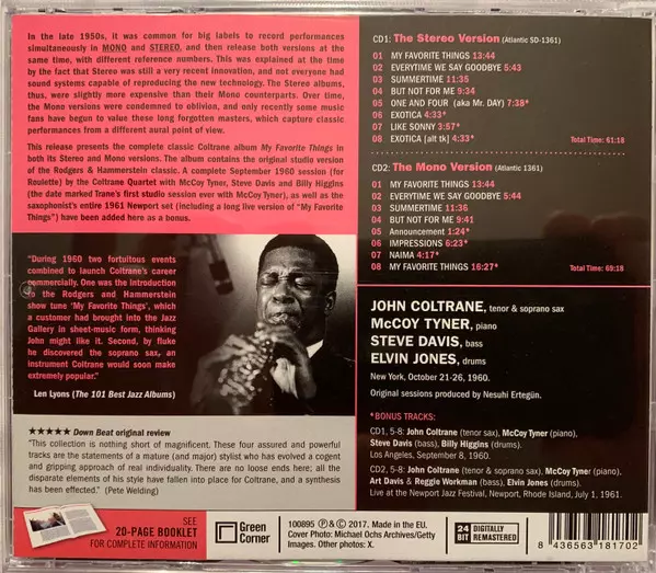 John Coltrane: My Favorite Things: The Stereo & Mono Versions A lemezen lévő változat 2CD - felújított kiadás. Ez a különleges kiadás - Európa a kiadó által Green Corner év 15. december 2017.