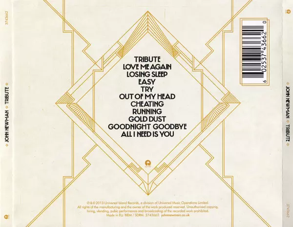 John Newman: Tribute A lemezen lévő változat CD - standard kiadás. Ez a különleges kiadás - Európa a kiadó által Island Records év 22. január 2016. Album műfajok között Pop és Funk / Soul.