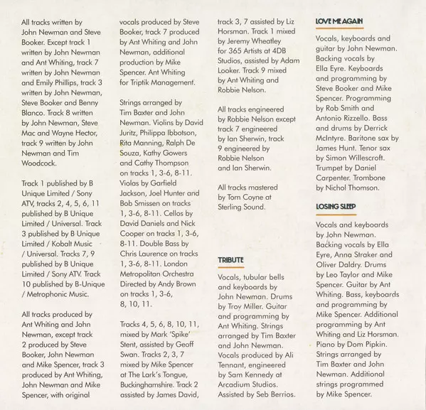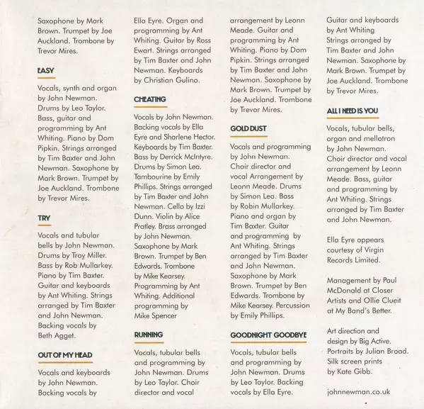 Arranged By [Strings] John Newman (5), Tim Baxter | Bass Robin Mullarkey | Choir [Director], Arranged By [Vocals] Leonn Meade | Drums Simon Lea | Guitar, Programmed By Ant Whiting | Percussion Emily Phillips | Piano, Organ Tim Baxter | Producer Ant Whiting, John Newman (5) | Saxophone Mark Brown (6) | Trombone Mike Kearsey | Trumpet Ben Edwards (2) | Vocals, Programmed By John Newman (5) | Written-By John Newman (5), Tim Woodcock