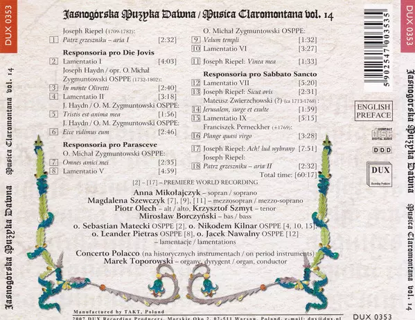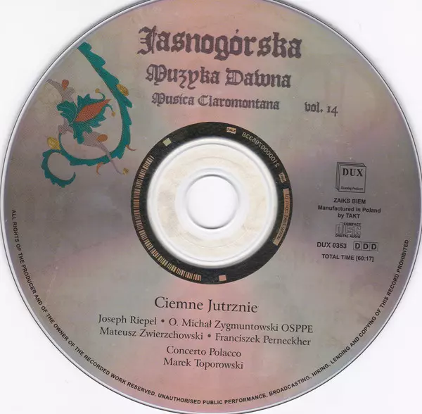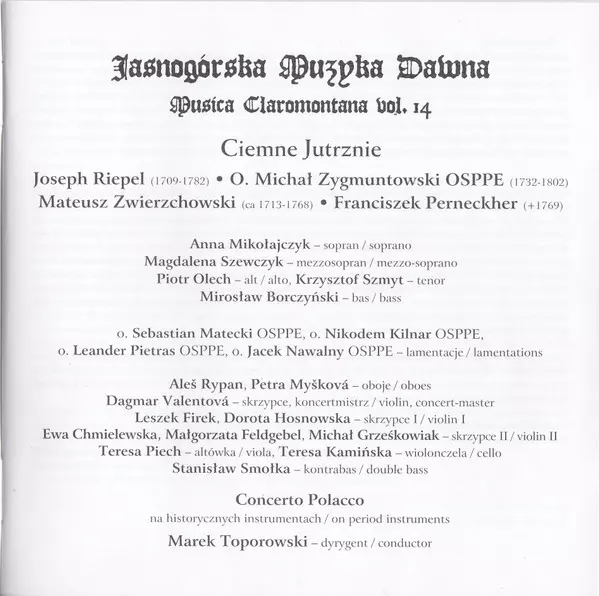 | Művész | Marek Toporowski | Concerto Polacco | Joseph Riepel | Michał Zygmuntowski | Mateusz Zwierzchowski | Francesco Perneckher |