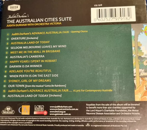 Orchestra Victoria: The Australian Cities Suite A lemezen lévő változat CD - standard kiadás. Ez a különleges kiadás - Ausztrália a kiadó által Decca év 1. május 2012. Album műfajok között Pop és Folk, World, & Country.