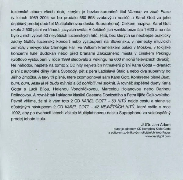 This album is a compilation of Karel Gott 's greatest hits from the last 50 years. It includes old classics like "So Give Me Your Phone" and "That's What I Like" as well as newer hits like "Love, Is Love". The album is a great representation of Gott's career and contains some of his most iconic songs.