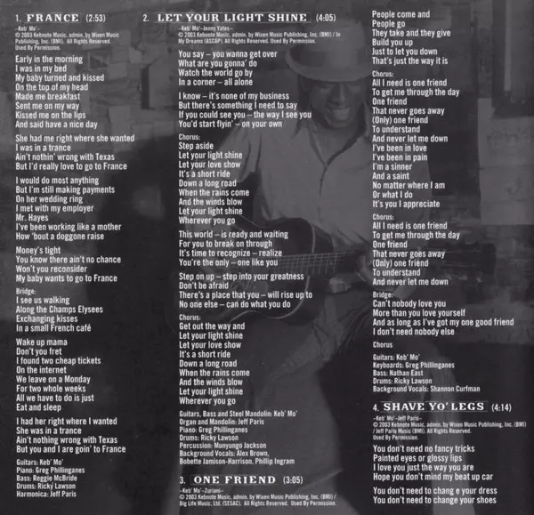 Bass Reggie McBride | Drums Ricky Lawson | Harmonica Jeff Paris | Piano Greg Phillinganes | Written-By, Guitar, Vocals Keb' Mo'