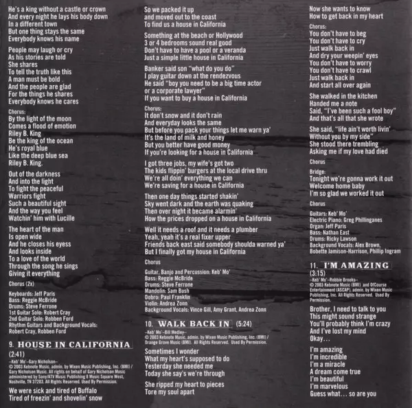 Bass Nathan East | Percussion Munyungo Jackson | Piano Greg Phillinganes | Written-By, Guitar, Vocals, Mandolin [Steel] Keb' Mo' | Written-By, Organ Jeff Paris