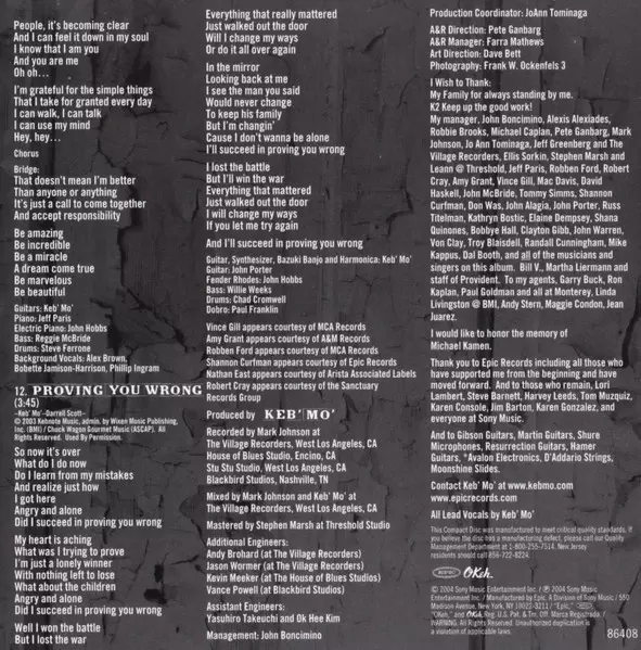 Backing Vocals Alex Brown, Bobette Jamison-Harrison, Phillip Ingram | Bass Reggie McBride | Drums Steve Ferrone | Electric Piano John Hobbs | Piano Jeff Paris | Written-By Robbie Brooks | Written-By, Guitar, Vocals Keb' Mo'