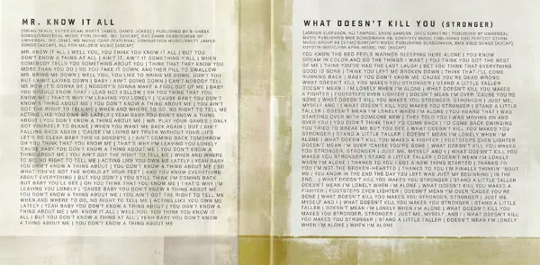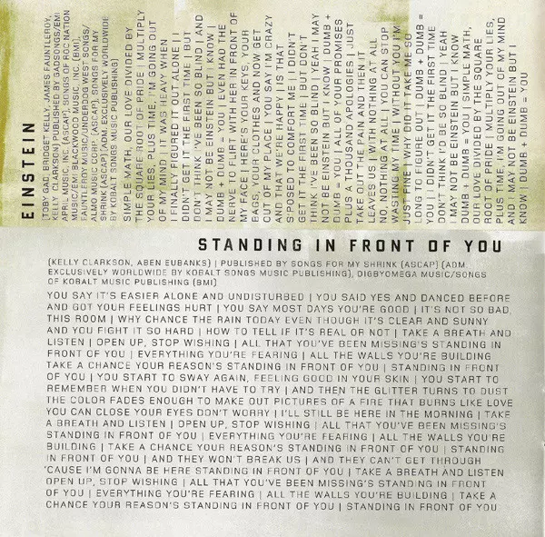 | Backing Vocals Kelly Clarkson | Instruments, Programmed By Toby Gad | Producer Toby Gad | Recorded By Toby Gad | Written-By Bridget Kelly, James Fauntleroy II, Kelly Clarkson, Toby Gad | |||
