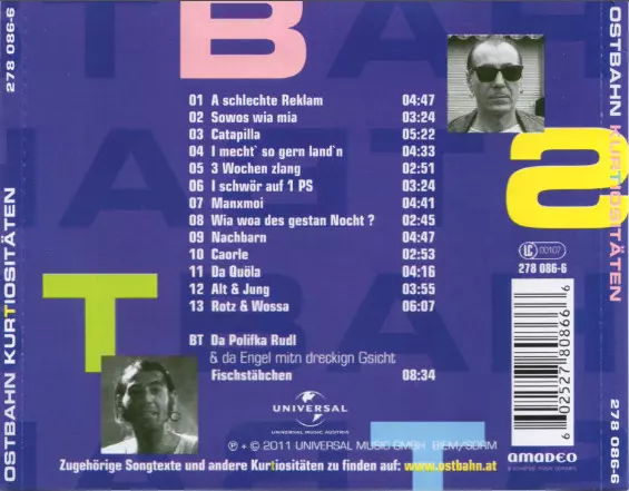 Kurt Ostbahn: Kurtiositäten A lemezen lévő változat CD - felújított kiadás. Ez a különleges kiadás - Ausztria a kiadó által Amadeo év 19. augusztus 2011. Album műfajok között Rock, Blues és Blues-Rock. Inkl. Bonus Track Frisch Gemastert 2010.