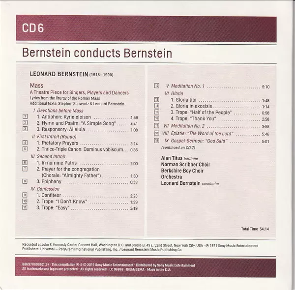 Leonard Bernstein: Bernstein Conducts Bernstein: Stage Works • Symphonies • Ballets • Choral Works • Songs A lemezen lévő változat 7CD/Dobozkészlet - standard kiadás. Ez a különleges kiadás - Európa a kiadó által Sony Classical év 25. március 2014. Album műfajok között Klasszikus zene, Színpad és képernyő, Contemporary classical és Neo-Romantic.