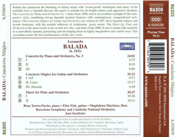 Művész | Jose Serebrier | Orquestra Simfònica De Barcelona I Nacional De Catalunya | Eliot Fisk | Leonardo Balada | Rosa Torres-Pardo | Magdalena Martínez |