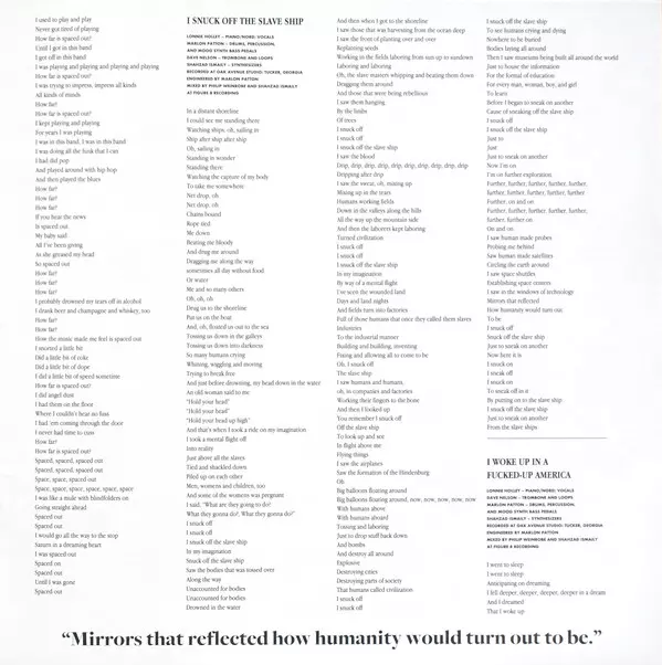 Drums, Percussion, Synth [Moog Synth Bass Pedals] Marlon Patton | Engineer Marlon Patton | Piano, Keyboards [Nord], Vocals Lonnie Holley | Synthesizer Shahzad Ismaily | Trombone, Loops David Nelson (2) | Written-By David Nelson (2), Lonnie Holley, Marlon Patton