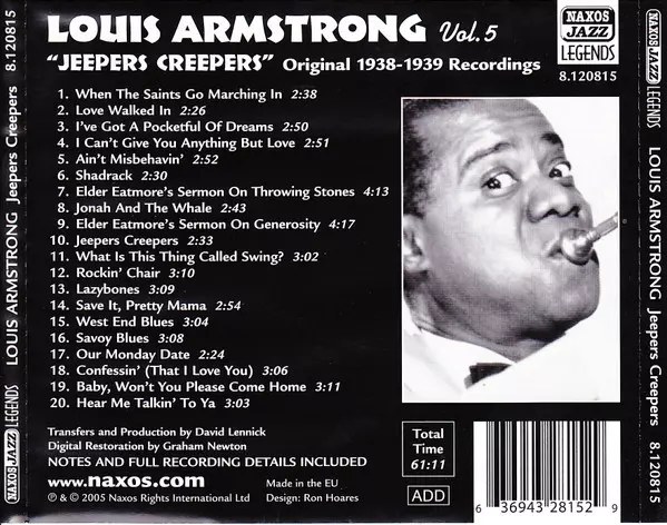 Louis Armstrong: Jeepers Creepers (Vol. 5 Original 1938-1939 Recordings) A lemezen lévő változat CD - standard kiadás. Ez a különleges kiadás - Európa a kiadó által Naxos év 9. február 2006. Album műfajba sorolható Jazz.