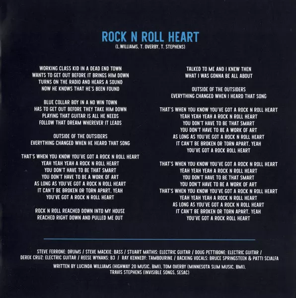 Backing Vocals Bruce Springsteen, Patti Scialfa | Bass Steve Mackey (3) | Drums Steve Ferrone | Electric Guitar Doug Pettibone, Stuart Mathis | Electric Organ [B3] Reese Wynans | Tambourine Ray Kennedy (2) | Written-By Jesse Malin, Lucinda Williams, Tom Overby
