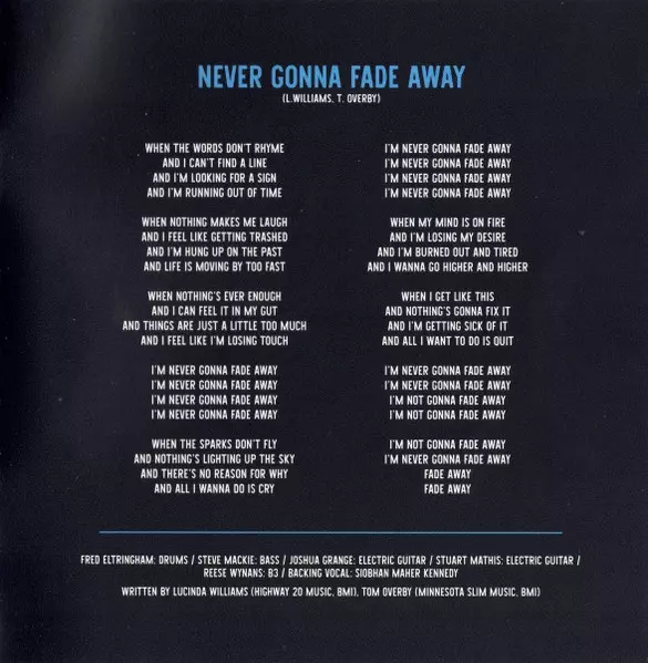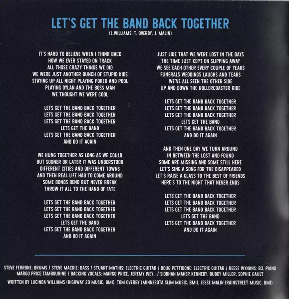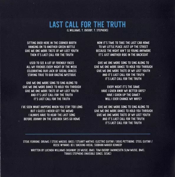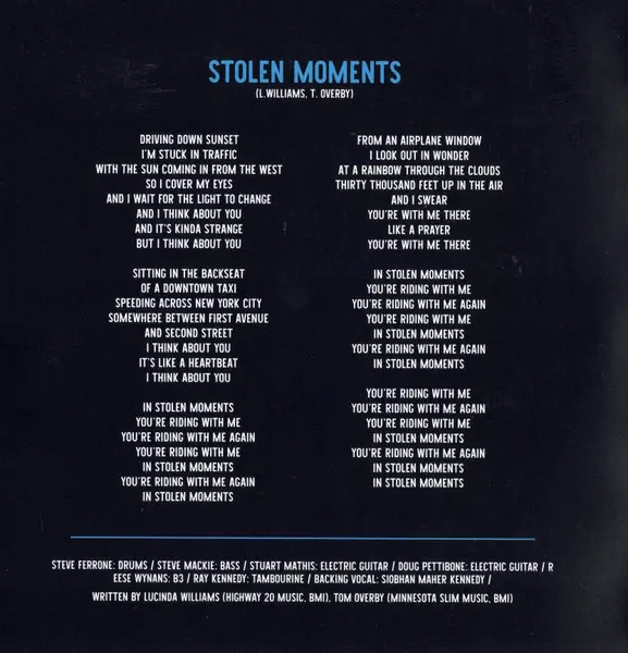 Backing Vocals Siobhan Maher-Kennedy | Bass Steve Mackey (3) | Drums Fred Eltringham | Electric Guitar Joshua Grange, Stuart Mathis | Electric Organ [B3] Reese Wynans | Written-By Lucinda Williams, Tom Overby
