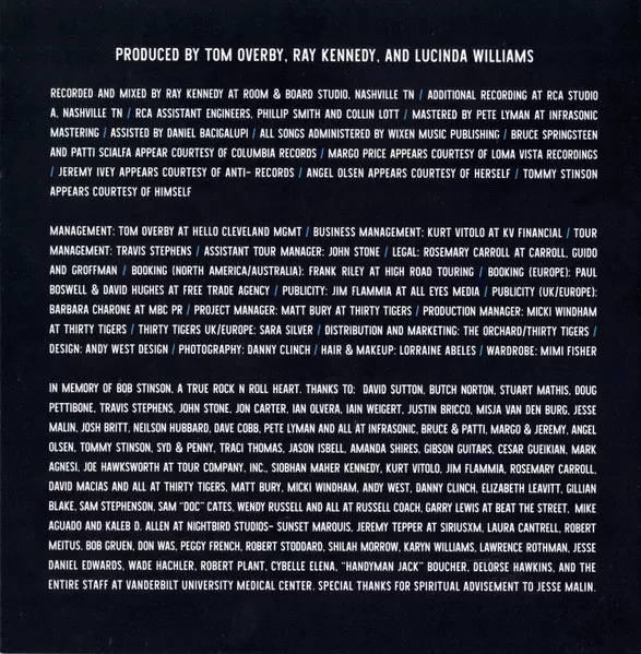 Arranged By [Strings, Horns, Chamberlin And Novachord], Recorded By [Strings, Horns, Chamberlin And Novachord] Lawrence Rothman | Bass Steve Mackey (3) | Drums Fred Eltringham | Electric Guitar Joshua Grange, Stuart Mathis | Written-By Lucinda Williams, Tom Overby, Travis Stephens